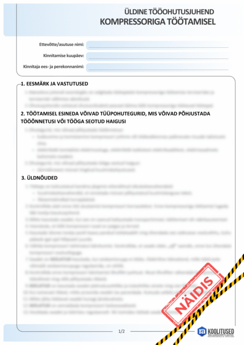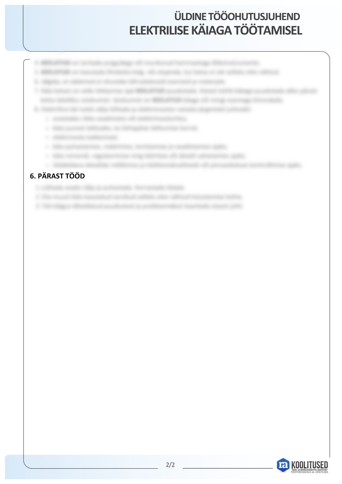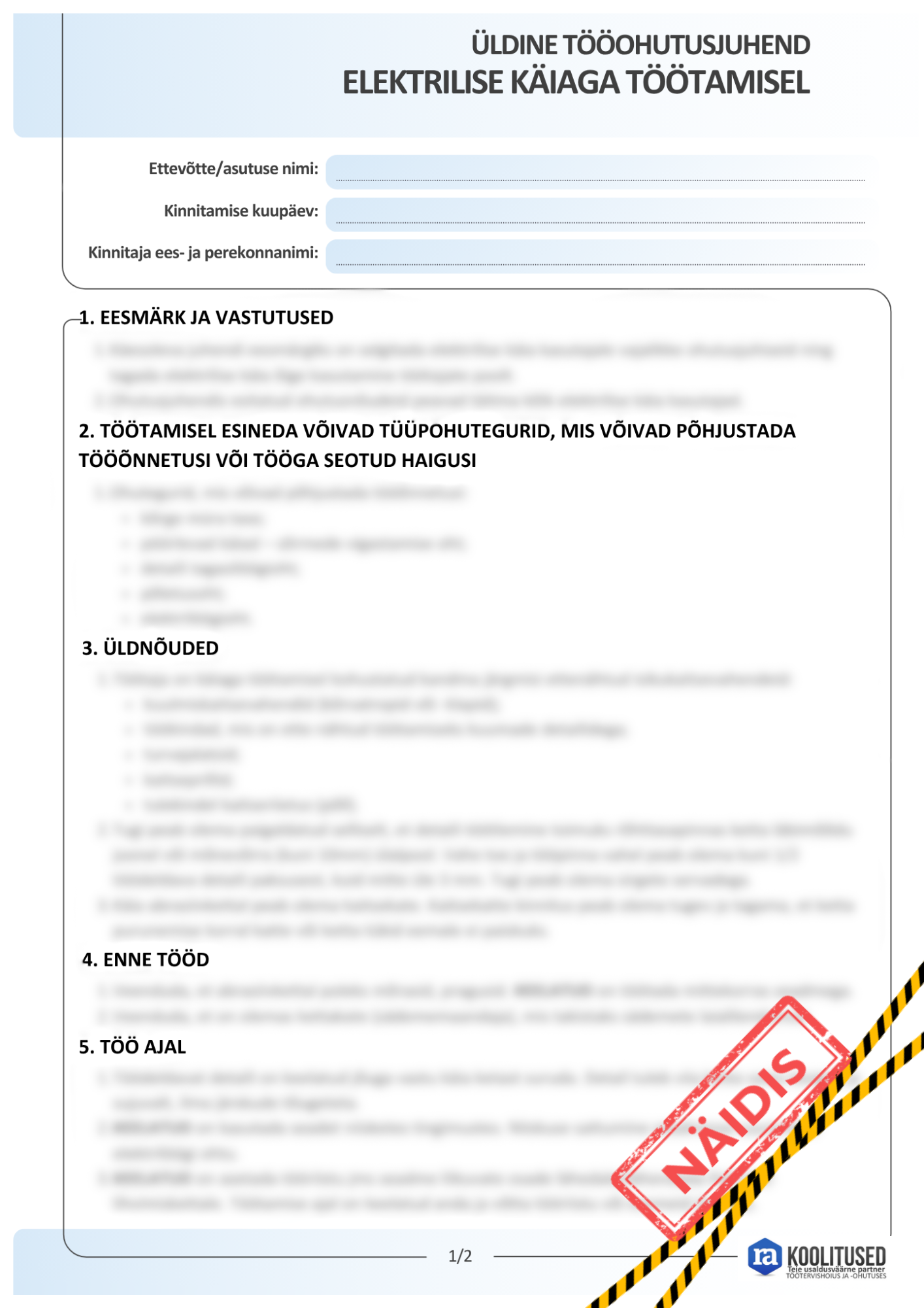 Elektrilise käiaga töötamise tööohutusjuhend annab töötajale ülevaate ohuteguritest, mis võivad põhjustada tööõnnetusi, ning selgitab meetmeid nende vältimiseks. Juhendis on välja toodud, milliseid isikukaitsevahendeid tuleb töötamisel kasutada, mida tuleb kontrollida enne töö alustamist ning millised on õiged töövõtted, et töötamine oleks ohutu.
