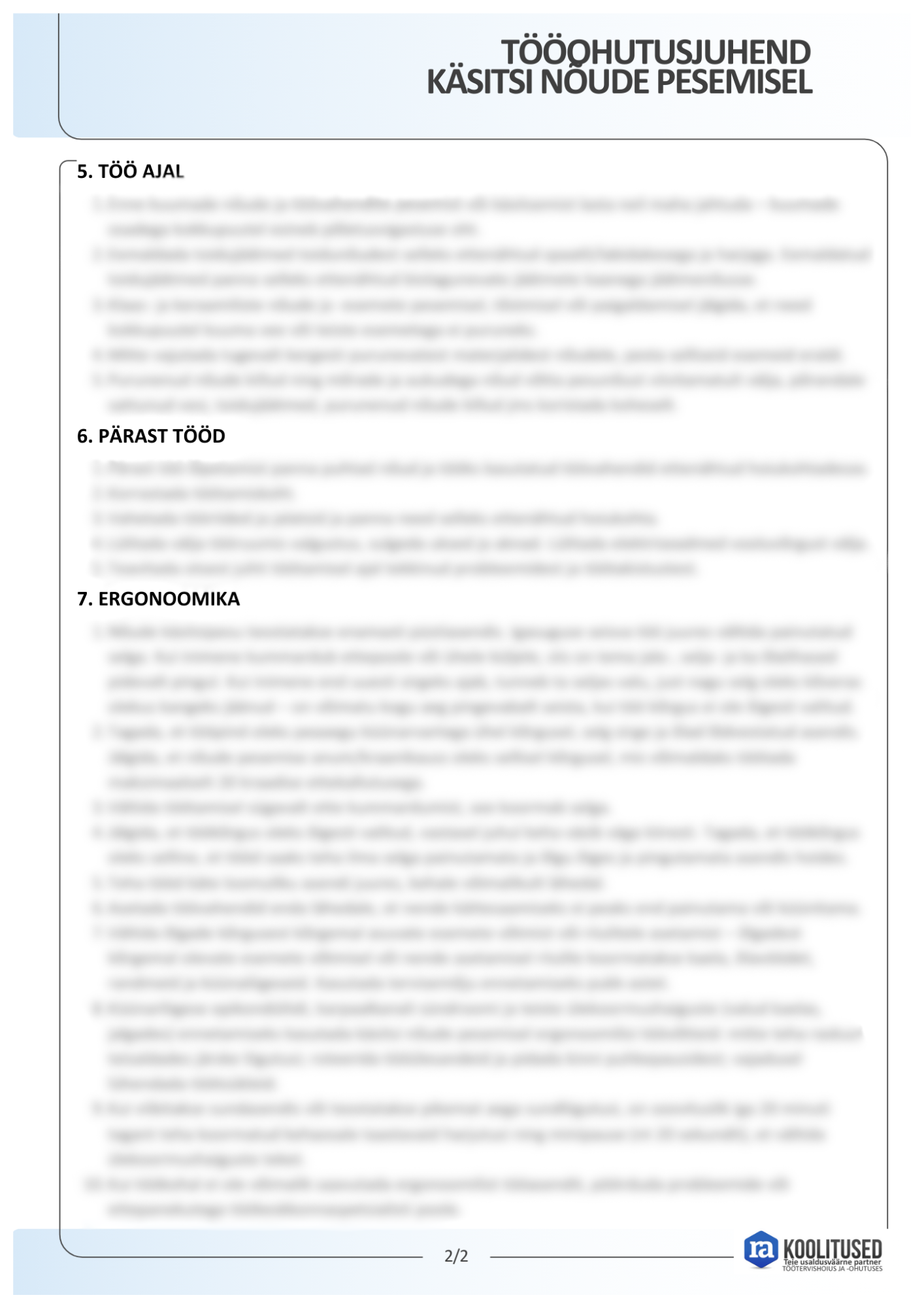 Käsitsi nõude pesemise tööohutusjuhend annab töötajale ülevaate käsitsi nõude pesemisega seotud terviseriskidest ning abinõudest nende vältimiseks. Juhendis on kirjeldatud võimalikud tööõnnetuse riskid ja kutsehaiguste tekkepõhjused ning selgitatud, kuidas neid igapäevatöös ennetada. Juhend käsitleb üldnõudeid, tööks ettevalmistumist, ohutut tegutsemist töö ajal ning tegevusi töö lõpetamisel. Samuti selgitatakse, milline on sobiv tööasend ja milliseid töövõtteid kasutada, et teha tööd ohutult ja tervist säästvalt.