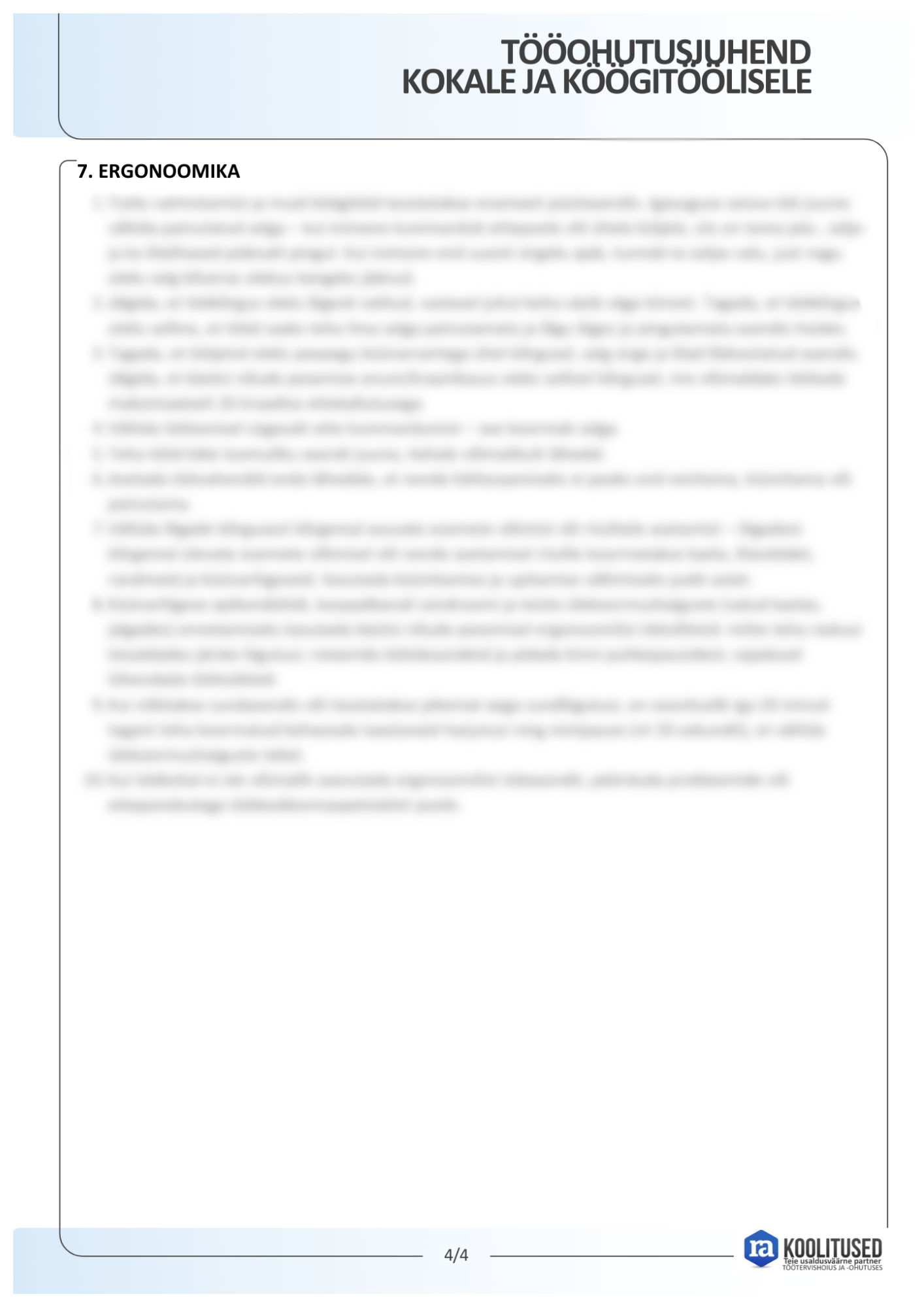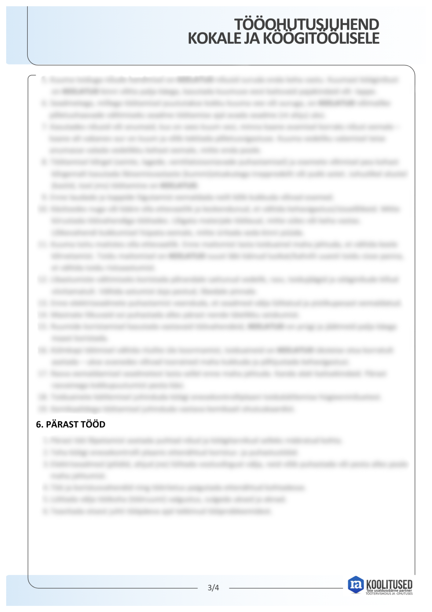 Koka ja köögitöölise tööohutusjuhend annab köögis töötavatele töötajatele ülevaate tööga seotud ohutusnõuetest, ohuteguritest ja abinõudest riskide vältimiseks. Juhendis on kirjeldatud tööõnnetuste ja kutsehaiguste tekkimisega seotud peamised ohud ning viisid nende ennetamiseks. Lisaks üldnõuetele selgitab juhend hügieeninõudeid ja kirjeldab, mida tuleb enne töö alustamist kontrollida. Samuti selgitatakse, millele pöörata tähelepanu töö tegemise ajal ning millised töövõtted aitavad vähendada õnnetuste riski ja tagada ohutu töötamine. Juhend käsitleb ka tegevusi pärast töö lõpetamist ning ergonoomilisi tööasendeid ja töövõtteid, mis aitavad teha köögitööd ohutult ja tervist säästvalt.