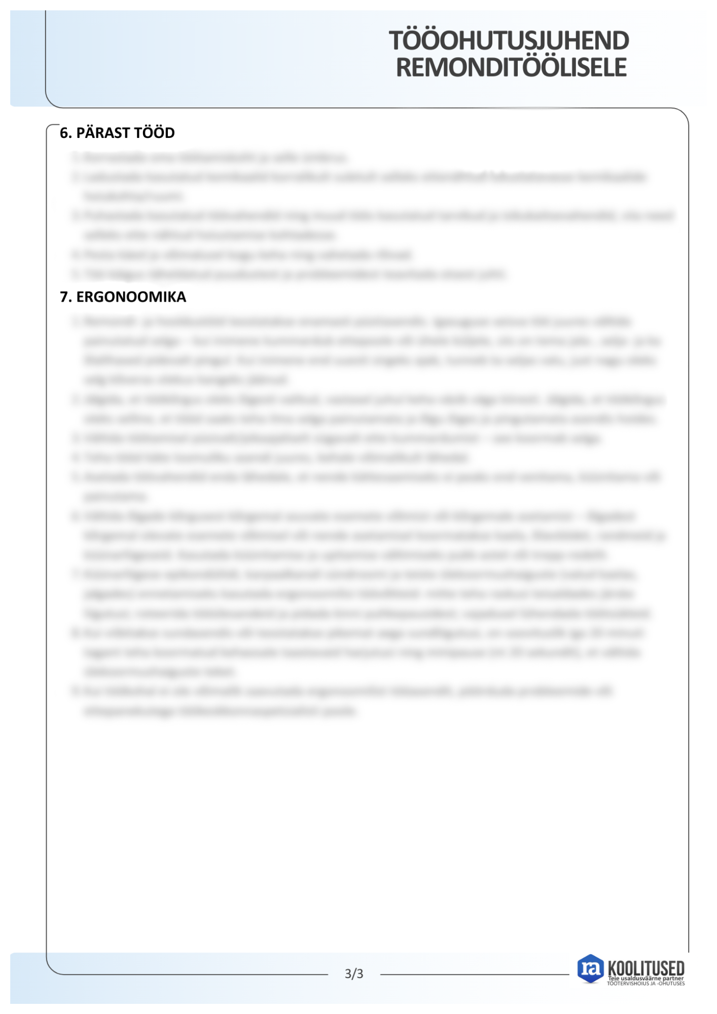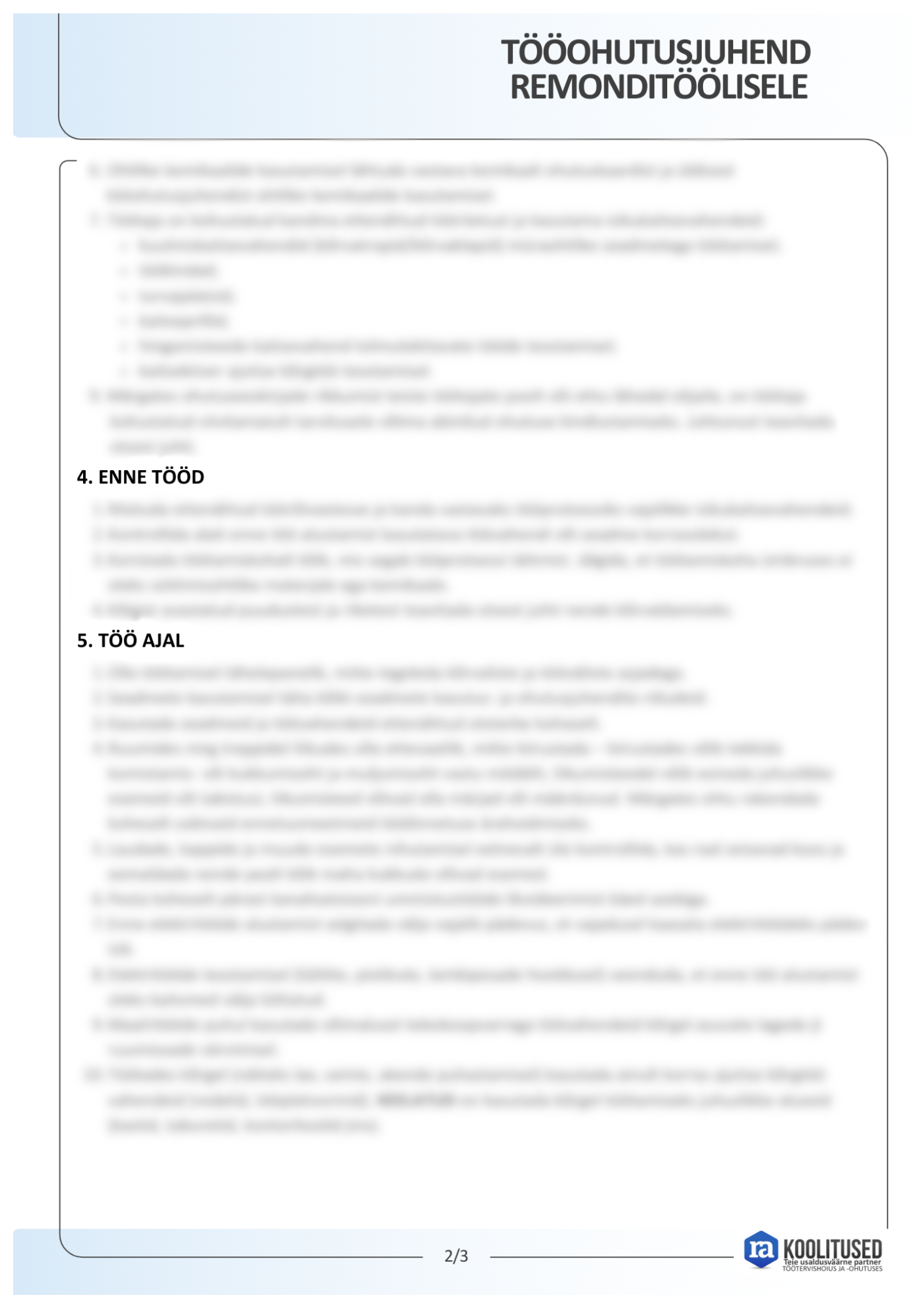 Remonditöölise tööohutusjuhend annab töötajale ülevaate remonditöödega seotud riskidest ja abinõudest nende ennetamiseks. Juhendis on kirjeldatud üldnõuded, sealhulgas isikukaitsevahendite kasutamise kord. Eraldi käsitletakse töökoha ettevalmistamist enne töö alustamist ning ohutut käitumist töö tegemise ajal. Samuti selgitatakse, millele tähelepanu pöörata erinevate remonditööde puhul, nagu elektritööd, maalritööd ja tööd kõrgustes. Juhend kirjeldab ka tegevusi pärast töö lõpetamist ning selgitab õigeid tööasendeid ja töövõtteid, et teha tööd ohutult ja tervist kahjustamata.